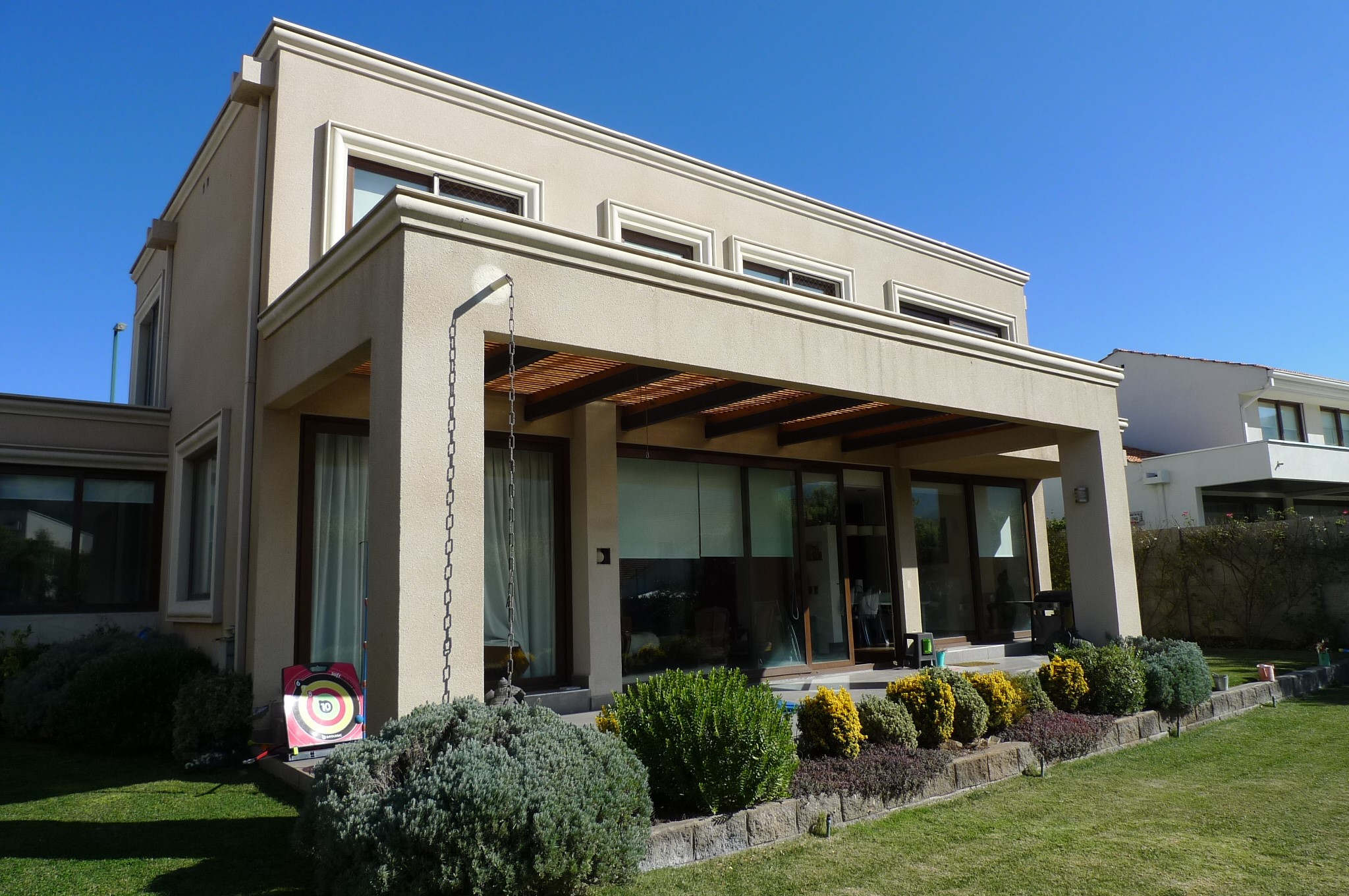 Estupenda casa en exclusivo condominio, barrio seguro cerca del colegio Monte tabor y muy buena conectividad. Primer Piso: hall de entrada, living y comedor separados con salida a la terraza techada, baño de visitas, amplia cocina con comedor de diario y logia techada ,servicios completos. Un dormitorio de buen tamaño, con baño completo y sala estar con salida a la terraza que puede ser usado como quinto dormitorio. Segundo Piso: Dos dormitorios que comparten un baño con dos ambientes, amplio y cómodo dormitorio principal en suite baño con jacuzzi, ventanas de termopanel, calefacción,estupendas terminaciones. Jardín formado con piscina y reja, Orientación nor-Oriente Condominio cerrado seguridad las 24 horas, estacionamiento para tres autos. Se entrega el 31 Agosto.