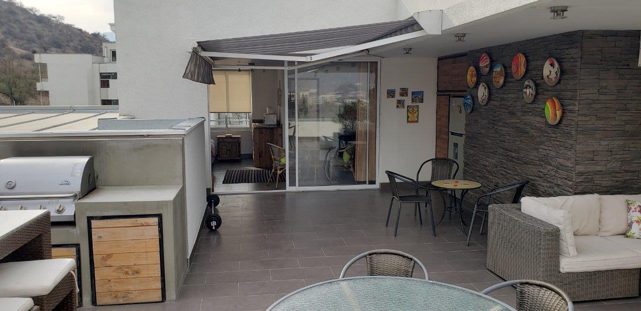 Al Fin ¡¡¡¡¡ Oportunidad de Departamento en Valle Monasterio con azotea de lujo,venta por Traslado .Inmejorable Ubicación y conectividad a Autopista Costanera Norte ,Vías principales,Aeropuerto , Centros urbanos y de servicio . Fabulosa Vista despejada a la cordillera .Cercanía a Colegios ( Santiago College - Everest -Newland ).Año construcción 2013. Hall de acceso con Living y comedor que converge a Terraza con vista al jardín del edificio . Baño Visita. Dormitorio principal en suite mas dos amplio dormitorios que comparten un baño adicional completo.- Consta de un Estudio y/o Dormitorio independiente en nivel superior con acceso independiente y con espectacular Terraza Equipada con Quincho .Área de servicios: Amplia Cocina con comedor de diario y Logia.Dormitorio de servicio con baño.Detalles :Pisos de recibos de piedra pizarra,Calefacción por losa a gas, medidor individual.Exteriores:- Edificio en Condominio con 2 departamentos por piso ,seguridad 24/7 ,Piscina , gimnasio y otros .3 estacionamientos y Bodega. Posibilidades de arriendo .UN IMPERDIBLE ¡¡¡.