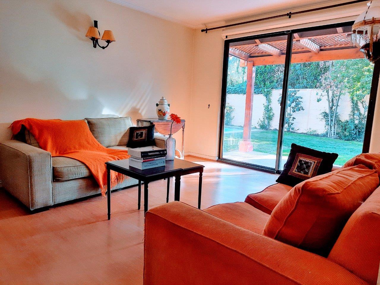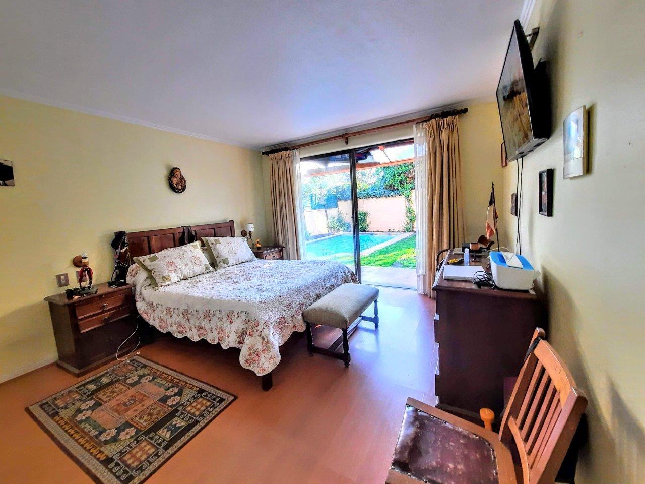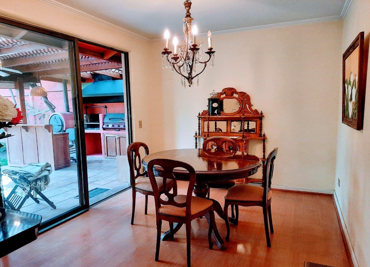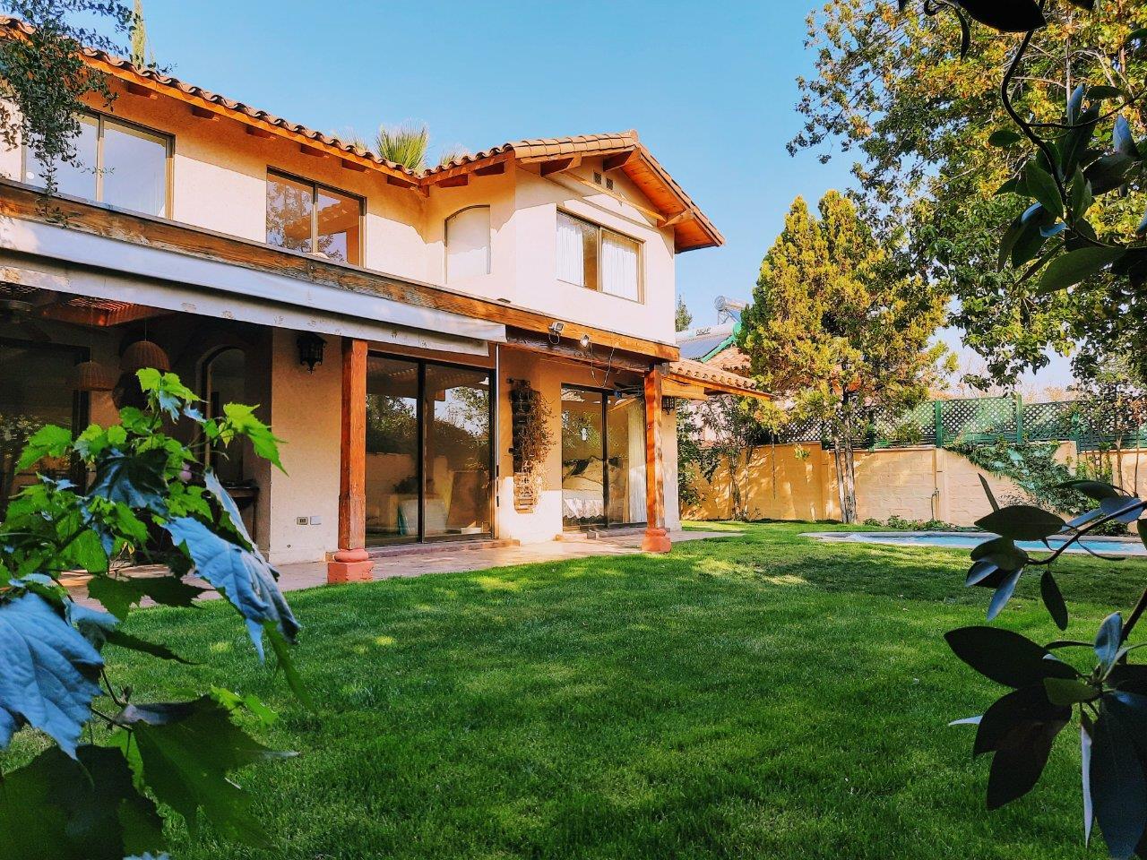 Casa ubicada en seguro Condominio, cercana a Colegios Huinganal y Mayflower. Primer Piso: Linving y Comedor a parte, Baño de visitas, Amplia cocina, logia enteramente techada y amoblada, Quincho full equipado con asador, horno y quemadores. Piscina Dormitorio principal en suite con escritorio/dormitorio Pieza y baño de Servicio Segundo Piso: Cuatro dormitorios y 2 baños Sala de estar
